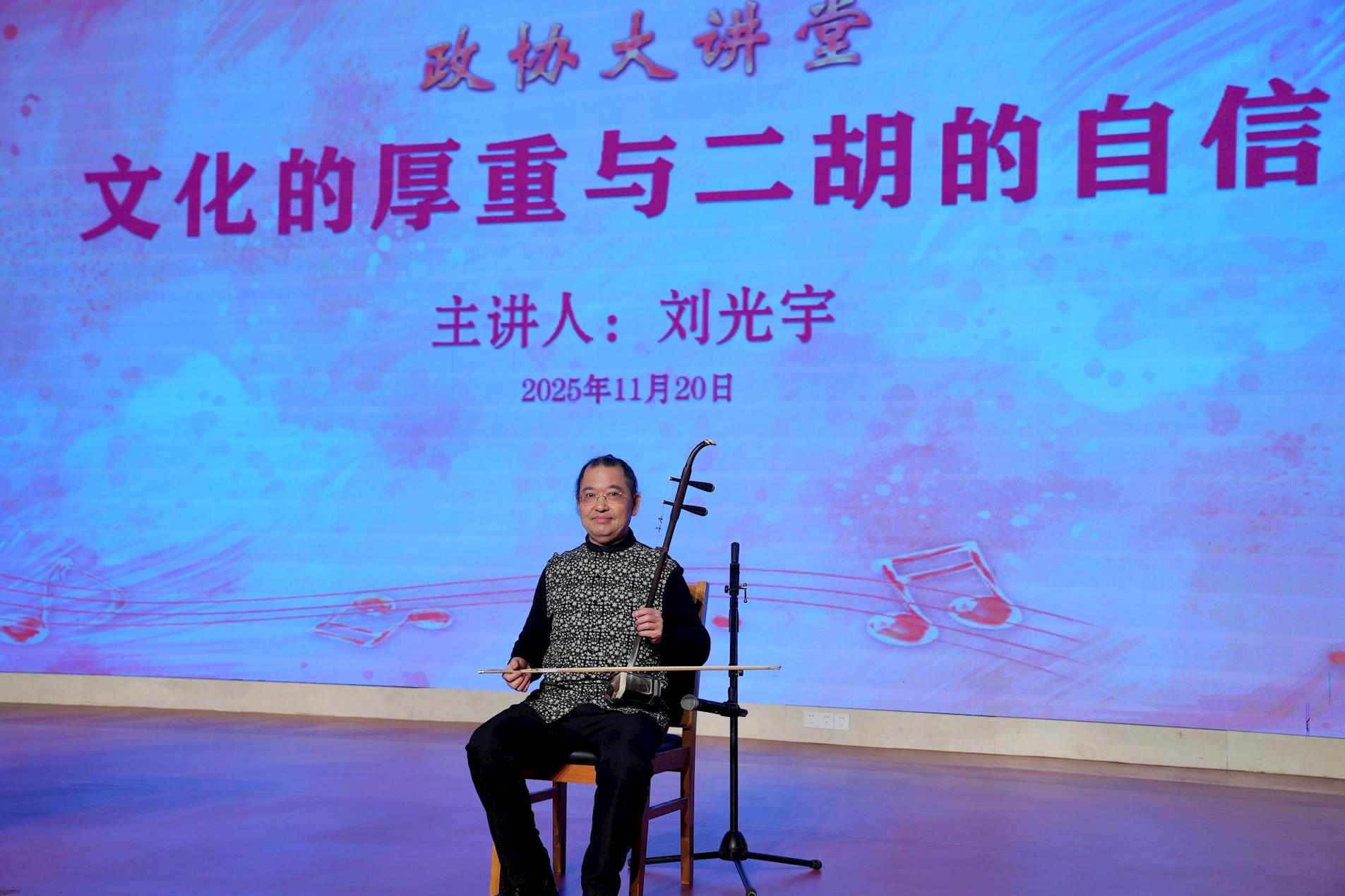 11月20日,区政协在区职教中心学术报告厅举办“政协大讲堂”,邀请著名二胡演奏家、中国音乐家协会民族弓弦乐学会副会长、重庆市文联副主席刘光宇,带来以《文化的厚重与二胡的自信》为主题的精彩分享。区政协主席黄孝明参加。