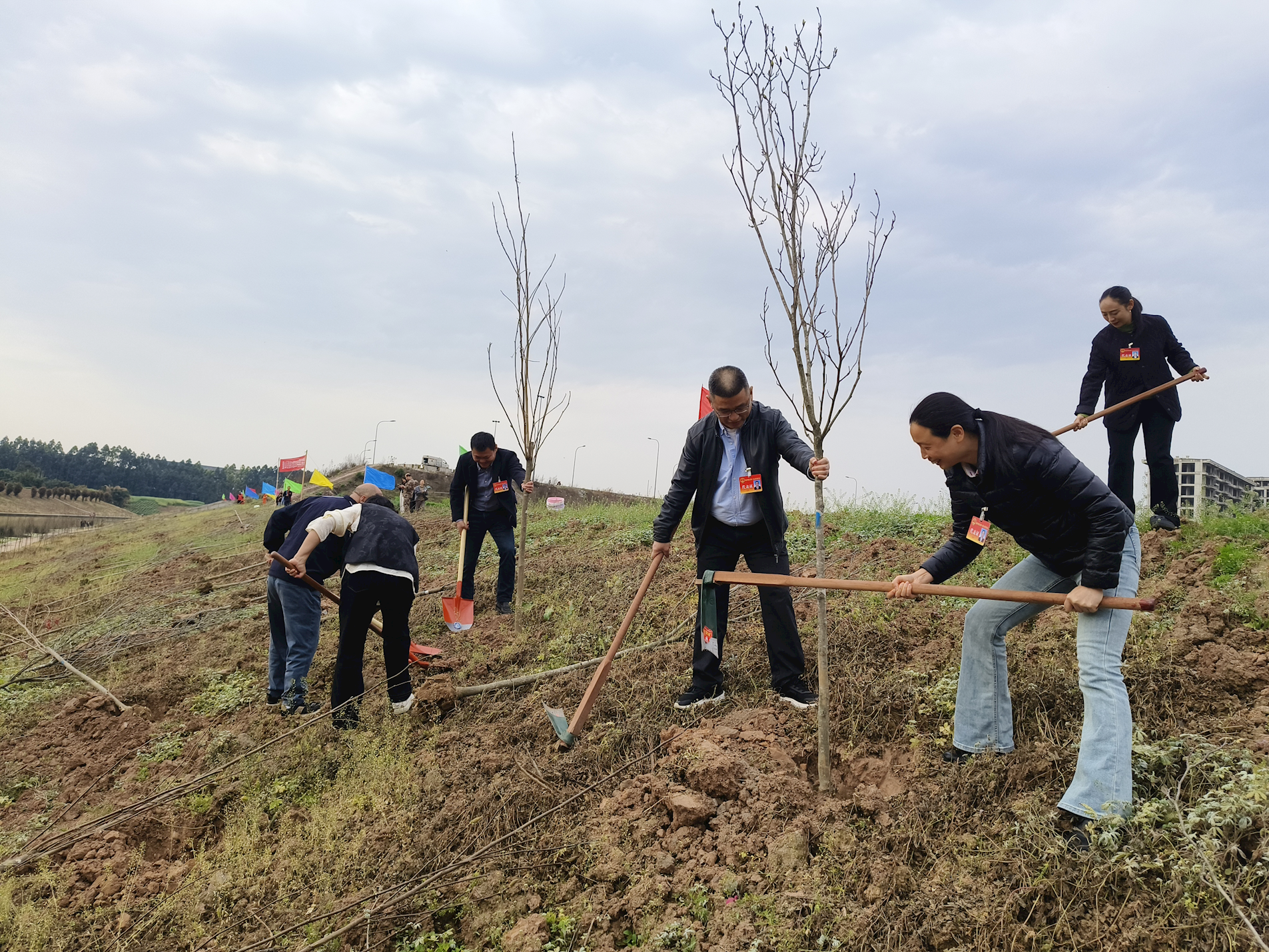 植树现场一派热火朝天的忙碌景象。人大代表们干劲十足,手持铁锹、水桶,分工协作、默契配合,有的挥锹铲土,动作娴熟有力,一锹锹沃土填入树坑;有的小心翼翼扶正树苗,确保株株挺立,仿佛为璧山的绿色未来筑牢希望之基;有的步履匆匆提桶往返,为新栽树苗浇下“生命之水”。在大家的共同努力下,400株紫玉兰昂然挺立在河岸,为春日璧山增添了勃勃生机。