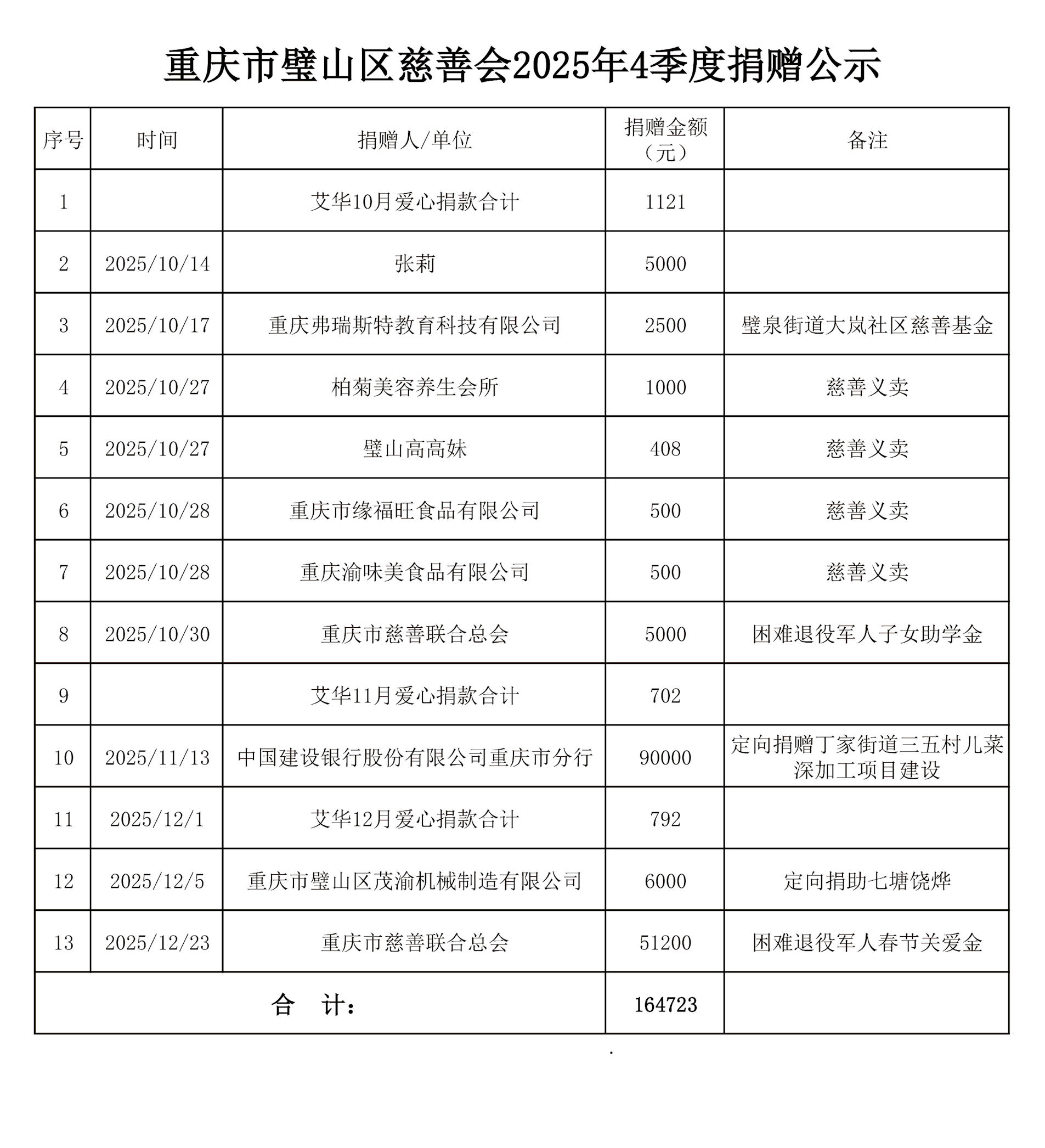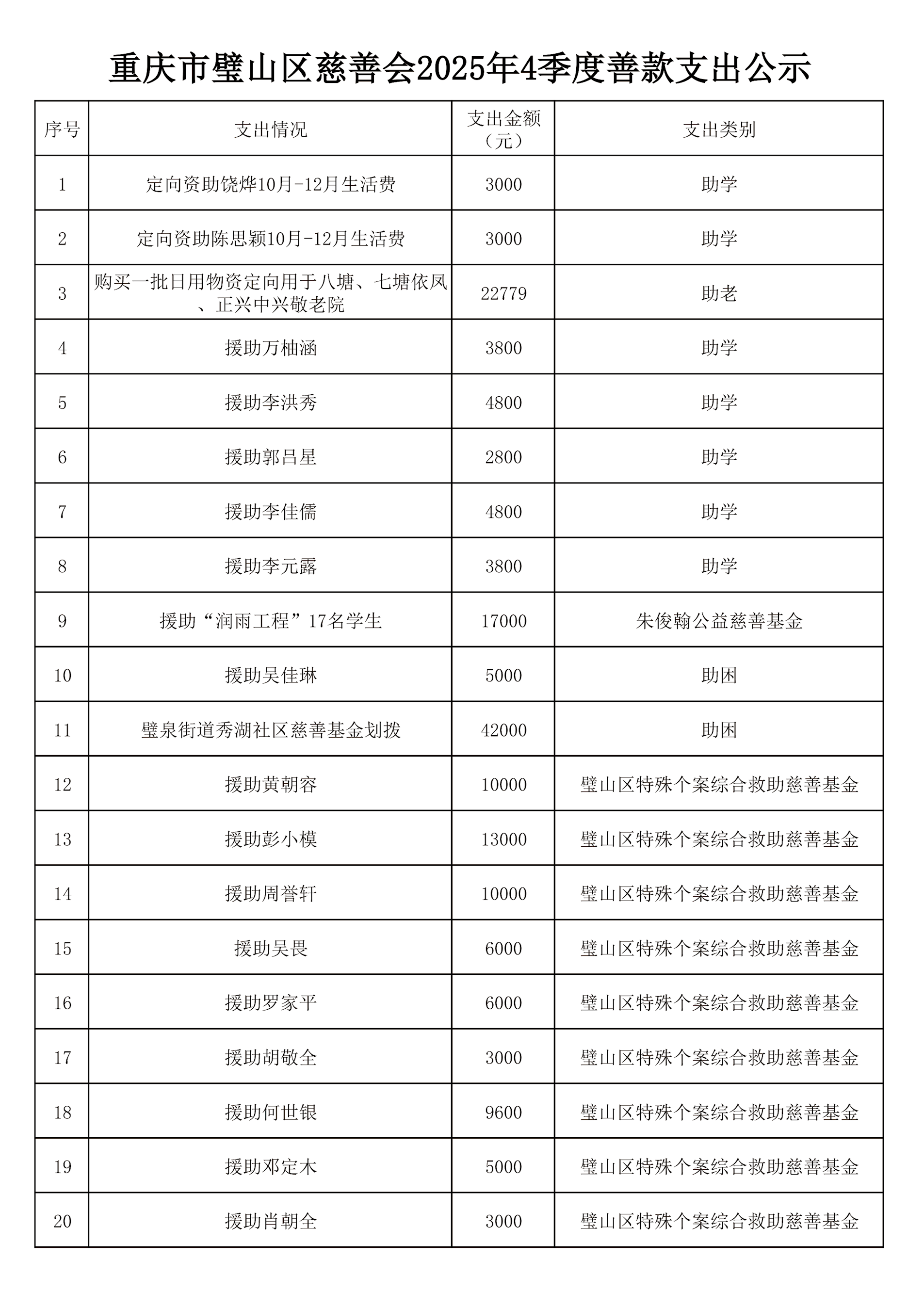 重庆市璧山区慈善会2025年4季度善款捐赠和支出公示