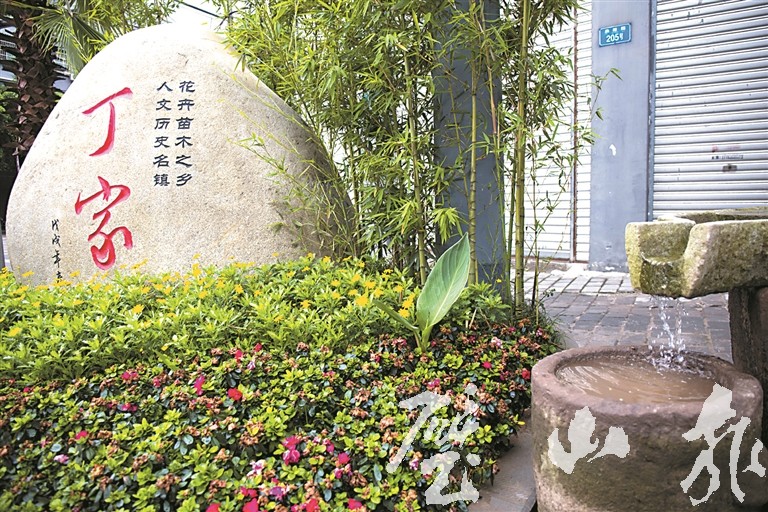 立放于成渝高速丁家下道口的文化石,上面刻着代表丁家生态和文化特色的字样——“花卉苗木之乡”“人文历史名镇”。