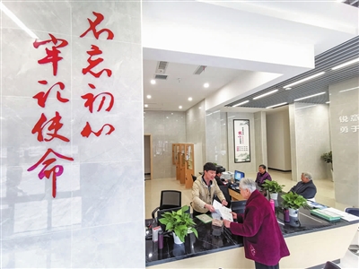 凤凰社区的工作人员对来社区服务大厅咨询、办理业务的居民细心服务。