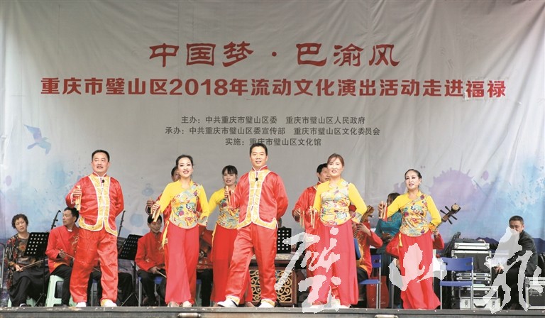 近日,主题为“中国梦·巴渝风”的流动文化演出在福禄镇广场上演。连日来,区文化委组织15场流动文化演出到15个镇街,将文艺演出送到群众家门口,精彩的歌舞、欢乐的小品、悠扬的乐器演奏等节目让基层群众精神文化生活更加丰富多彩。