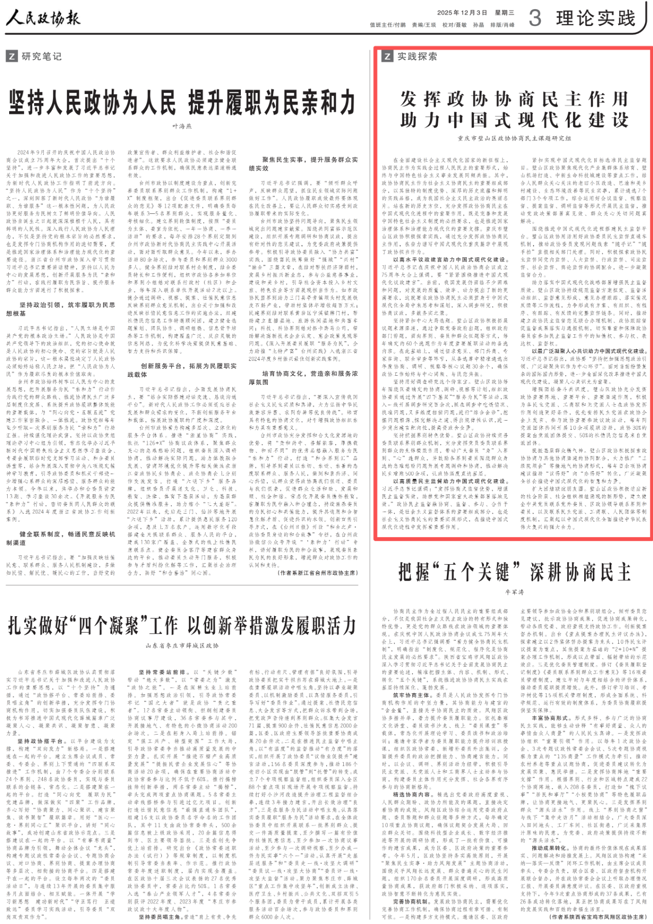 12月3日出版的《人民政协报》第3版刊发《发挥政协协商民主作用 助力中国式现代化建设》,全文如下——