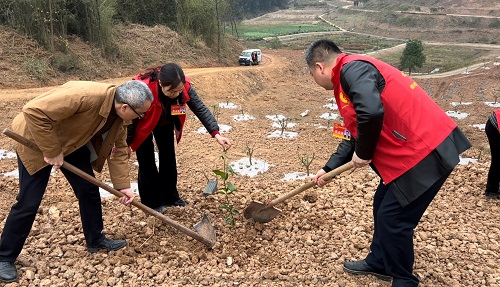植树现场,代表们纷纷拿起铁锹、锄头三人一组,五人一群,有的挥锹铲土、有的扶树填土、有的浇水灌溉……配合默契、干劲十足,忙得不亦乐乎。经过两个小时的劳动,通过人大代表、机关干部和志愿者们的通力合作,300余棵柑橘树苗在山坡上“安家落户”。